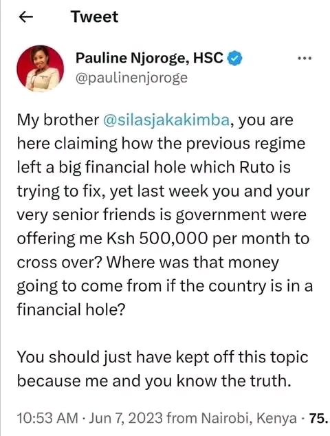 On 7th of July, Pauline Njoroge exposed the government very badly. Through her post on Twitter, Pauline Njoroge called out government for saying that it does not have money by disclosing that it is offering her half a million per month to stop the critics and join them.