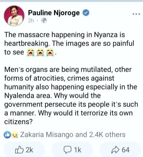 In the above post, Pauline Njoroge was exposing the recent act of police raiding homes in Nyalenda area. She wrote, “The massacre happening in nyanza is heartbreaking, the images are so painful to see😭😭😭.” This exposed the police brutality very badly.
